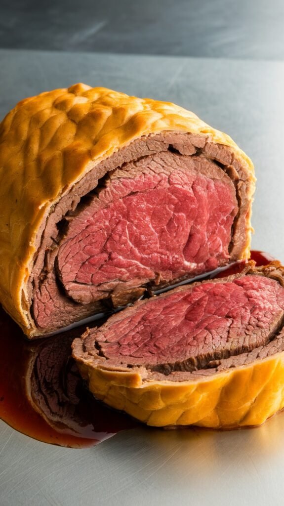 Beef Wellington is a classic dish that brings a touch of elegance to any New Year’s Eve dinner. This stunning centerpiece features a juicy beef tenderloin wrapped in a layer of mushroom duxelles and encased in golden puff pastry. The image captures the rich, pink interior of the beef, perfectly cooked and inviting.