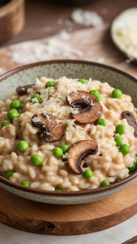 To make this risotto, you will need Arborio rice, fresh mushrooms, peas, vegetable broth, onion, garlic, white wine, and parmesan cheese. Start by sautéing the onion and garlic until fragrant, then add the mushrooms and cook until tender. Stir in the rice and toast it for a minute before adding the wine. Gradually add the broth, stirring constantly until the rice is creamy and al dente. Finally, fold in the peas and parmesan for a rich finish.