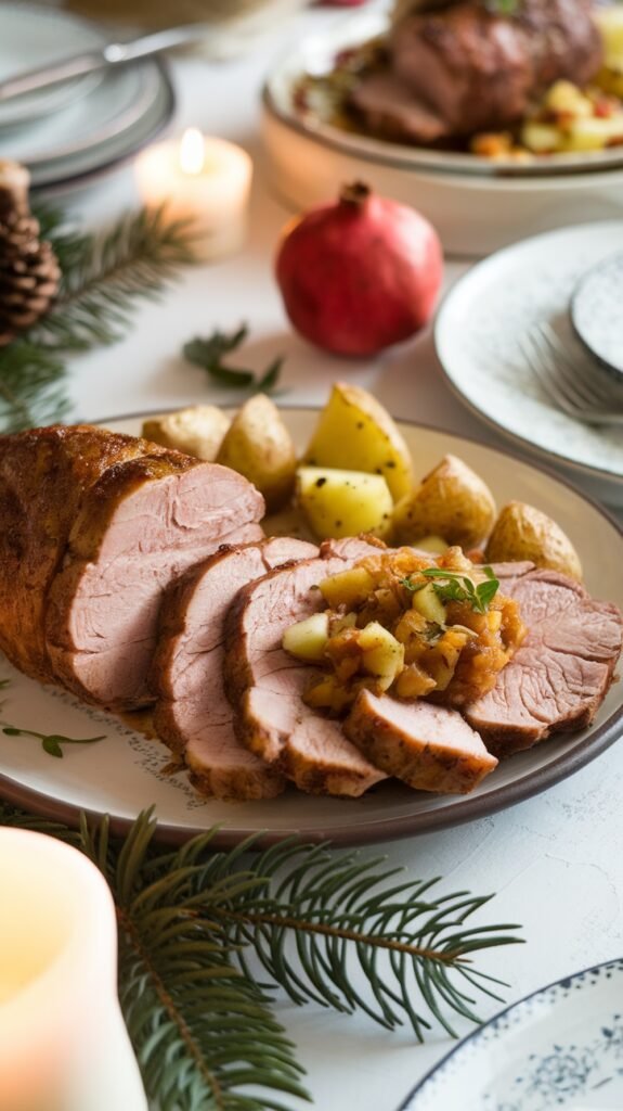 Pork tenderloin with apple chutney is a fantastic dish to serve on New Year’s Eve. The combination of juicy pork and sweet, tangy chutney creates a delightful balance of flavors. The image shows a beautifully cooked pork tenderloin, sliced to reveal its tender interior. It’s paired with golden roasted potatoes and a generous scoop of apple chutney, making it visually appealing and mouthwatering.
