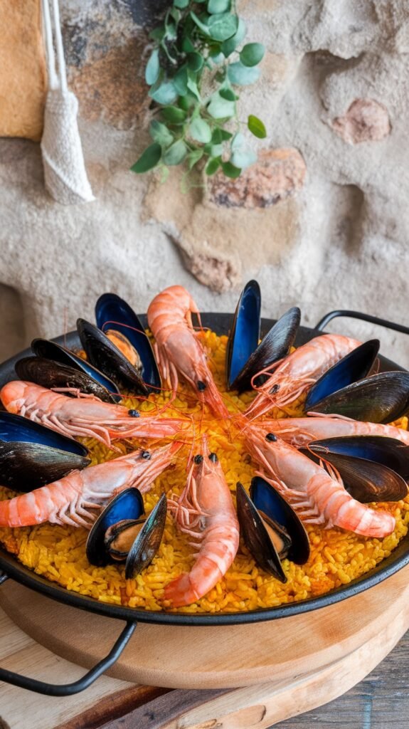 To make this paella, you’ll need ingredients like short-grain rice, saffron, shrimp, mussels, and a mix of spices. Start by sautéing onions and garlic, then add the rice and saffron. Gradually pour in broth and let it simmer. Finally, layer the seafood on top and cook until everything is tender.