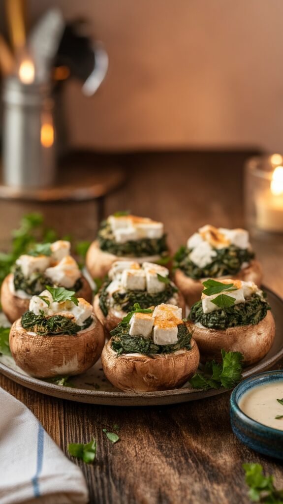 Stuffed mushrooms are a fantastic choice for your New Year’s Eve dinner. They are bite-sized, packed with flavor, and easy to share. The image shows a beautiful platter of mushrooms filled with a vibrant spinach and feta mixture. The golden-brown tops and fresh herbs make them look irresistible.
