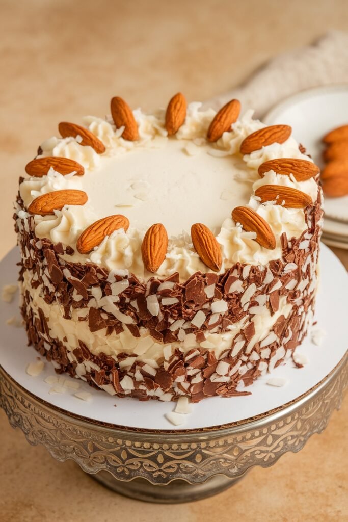 To make this cake, you’ll need ingredients like flour, sugar, cocoa powder, eggs, and of course, almonds and coconut. Start by baking the chocolate layers, then whip up a fluffy frosting. Once the cake is assembled, generously coat the sides with chocolate shavings and sprinkle coconut on top. The finishing touch is a ring of almonds that adds both crunch and elegance.