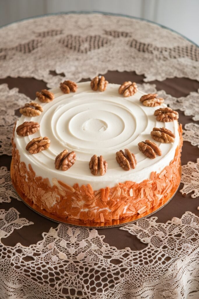 Carrot cake is a classic dessert that brings warmth and nostalgia to any gathering. This version, topped with creamy frosting, is a true crowd-pleaser. The cake is beautifully decorated with pecans, adding a nice touch of elegance.