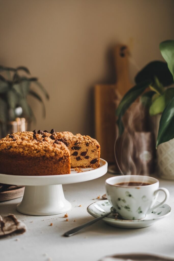 Chocolate chip coffee cake is a delightful treat that combines the rich flavors of chocolate with the comforting essence of coffee. The image shows a beautifully baked cake, golden brown and topped with a crumbly streusel. A slice has been cut out, revealing its moist interior filled with chocolate chips. This cake is perfect for any occasion, whether it’s a cozy brunch or a sweet afternoon snack.