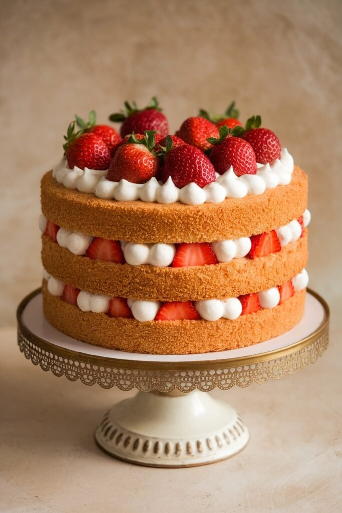 The Classic Victoria Sponge Cake is a timeless treat that never fails to impress. This cake is light, fluffy, and perfect for any occasion. The image shows a beautifully layered sponge cake, filled with fresh strawberries and whipped cream. Topped with even more strawberries, it looks absolutely delightful!