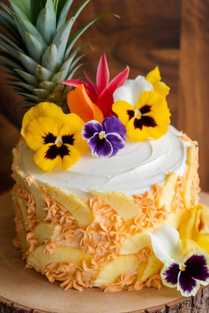 Once cooled, stack the layers with generous amounts of cream cheese frosting in between. Decorate the top with pineapple slices and edible flowers for a stunning finish. This cake is perfect for celebrations or just a sweet treat at home!