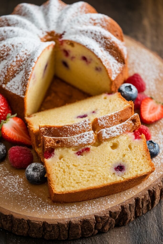 Old-fashioned pound cake is a classic dessert that never goes out of style. The image shows a beautifully baked pound cake, sliced to reveal its soft, moist interior. Topped with a light dusting of powdered sugar, it looks inviting and delicious. Surrounding the cake are fresh strawberries, raspberries, and blueberries, adding a pop of color and a hint of freshness.