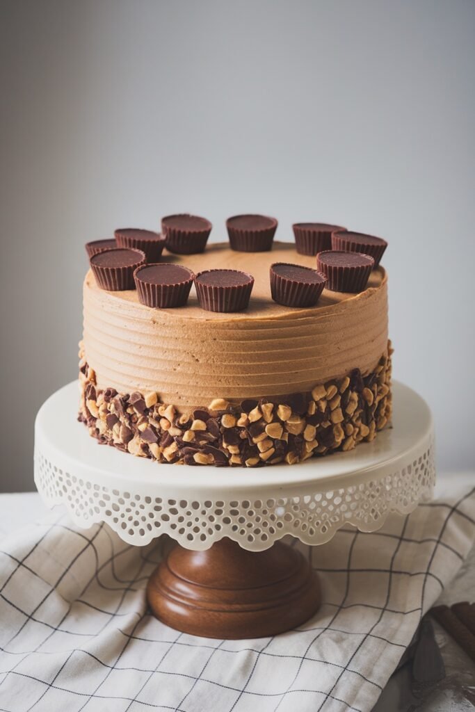 This Peanut Butter Cake is a delightful treat for anyone who loves the rich combination of peanut butter and chocolate. The image shows a beautifully layered cake topped with creamy chocolate frosting and adorned with mini peanut butter cups. The cake is set on a charming cake stand, making it a perfect centerpiece for any gathering.