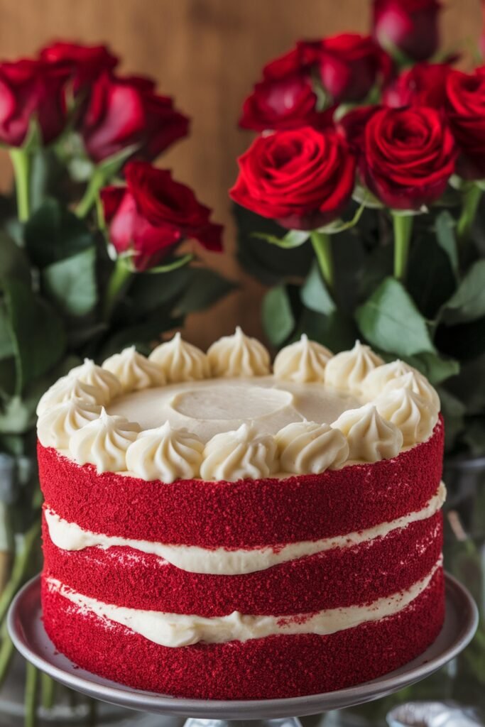This cake is often adorned with decorative swirls of frosting on top, making it a showstopper at parties. Pair it with fresh flowers, like red roses, for a romantic touch. Whether for a birthday, anniversary, or just a sweet treat, Red Velvet Cake is sure to impress!