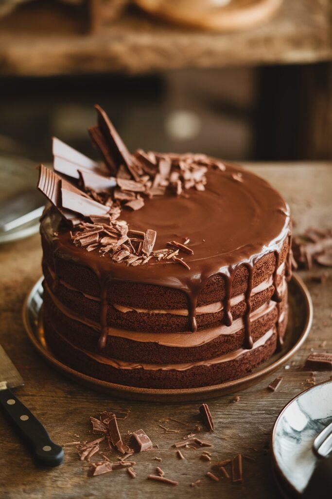 Once cooled, stack the layers with rich chocolate frosting in between. The frosting not only adds flavor but also gives the cake a stunning finish. Top it off with chocolate shavings for that extra touch. This cake is perfect for birthdays, celebrations, or just a sweet treat at home.