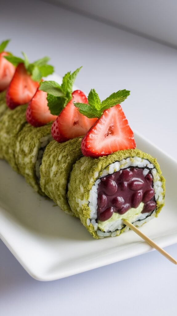 Matcha green tea sushi dessert is a fun twist on traditional sushi. This sweet treat features a delightful combination of matcha, rice, and red bean paste, all rolled up and topped with fresh strawberries. It’s a unique way to enjoy sushi that satisfies your sweet tooth!