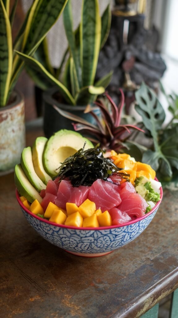 A tropical poke bowl with fresh tuna is a perfect way to enjoy sushi at home. This colorful dish features tender tuna, creamy avocado, and sweet mango, all beautifully arranged in a bowl. Top it off with seaweed for an extra burst of flavor and a delightful crunch!