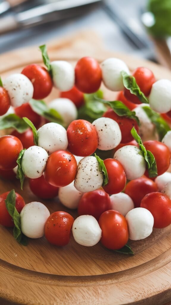 Mini Caprese skewers are a fun and fresh way to kick off your New Year’s Eve celebration. Just thread cherry tomatoes, mozzarella balls, and fresh basil onto skewers for a colorful bite-sized treat. Drizzle with balsamic glaze for an extra burst of flavor!