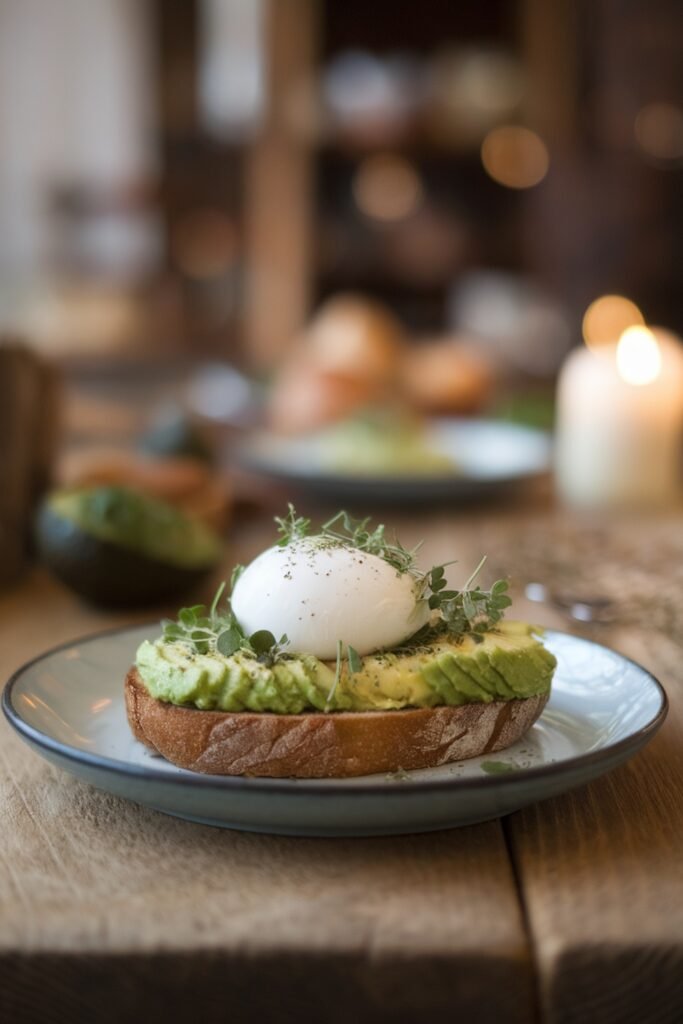 To make this dish, start with ripe avocados. Mash them with a bit of salt and pepper for flavor. Toast your favorite bread until golden brown. For the poached egg, gently simmer water and add a splash of vinegar. Crack the egg into a small bowl, then slide it into the water. Cook for about three minutes for a runny yolk.