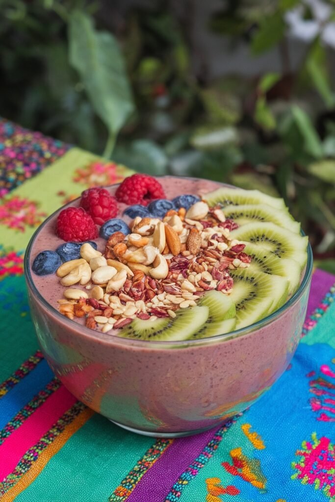 In this bowl, you’ll find a creamy base made from blended fruits, topped with a variety of nuts and seeds. The combination of raspberries, blueberries, and kiwi not only adds sweetness but also provides antioxidants. The nuts and seeds add a satisfying crunch and healthy fats.