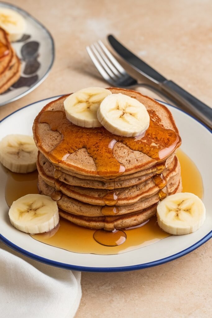 Whole grain banana pancakes are a fantastic way to kickstart your day. They are fluffy, delicious, and packed with nutrients. The image shows a tall stack of pancakes topped with fresh banana slices and a drizzle of syrup, making them look irresistible.